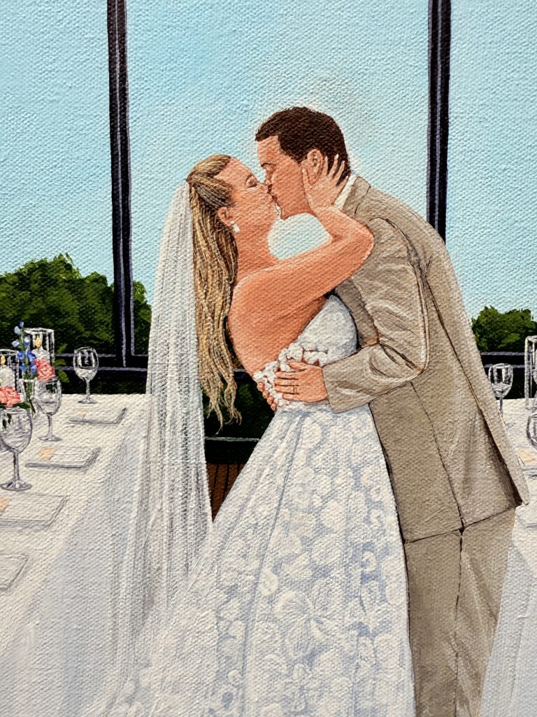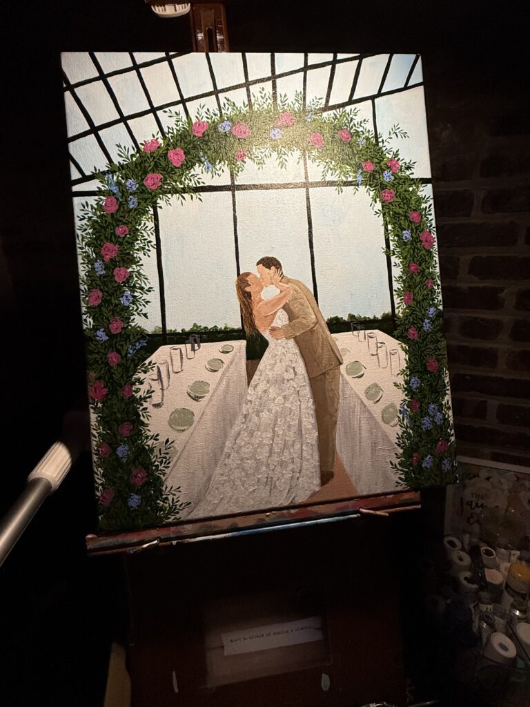 Sierra and Jake wanted me to emphasize the bright, floral vibes of their wedding day in my painting, preferring to showcase the floral arch and gorgeous table-scapes over the city views of their venue.